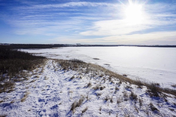 After gathering what I needed - GPS receiver, hiking pole, camera, micro-spikes in case I needed them on the ice, two touques and gloves - I set out through the campground and soon began walking on the snow-crusted ice.