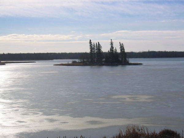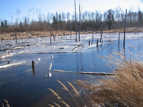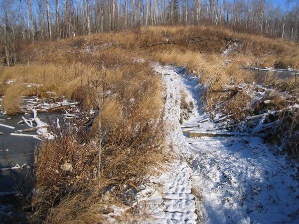 I walked down the little trail, crossing a beaver damn that I’d seen in the log pictures of others, passed a little hut which seemed to used very little, and on to the cache area which promised to be on a point on the lake. The description suggested following blue diamond ski markers to the cache area, which I did, all the time wondering how anyone could ski on this very hilly terrain (Sask. roots showing there).