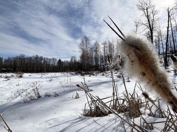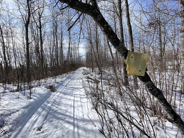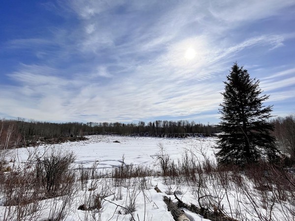 I started out from the Mandy Lake Parking spot today and proceeded to so something I’d never done before: walk directly over the nearby frozen pond. In other, warmer, seasons one has to take the trails that skirt around the edge of the pond, but today it was the express route, of course with that initial doubt about the thickness of the ice and the quiet fear of just breaking through.