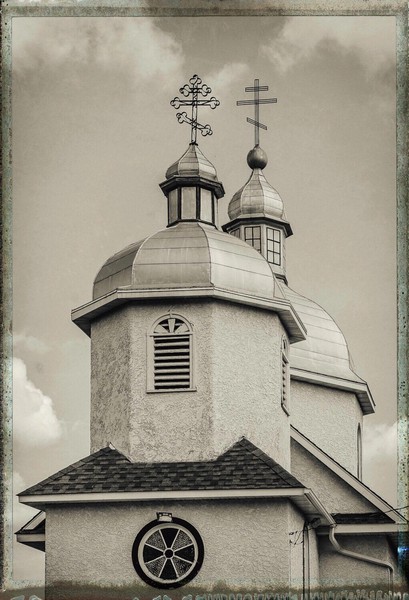 As the “Lamont County’s Self-Guided Church Tours” guidebook points out, “St. James is unusual in that the belfry, which is situated over the narthex [i.e. the front entrance way] is an integral part of the church, whereas the majority of the churches built by the Ukrainian pioneers have freestanding bell towers, as was the tradition in the Old Country. (Source)