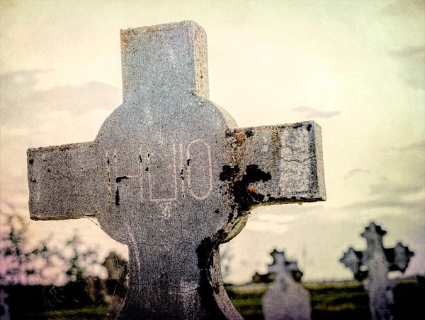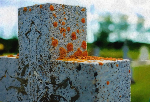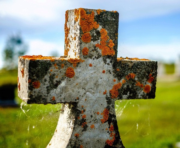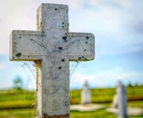 A quaint church has as beautiful, imposing bell tower and well-kept cemetery beside it.